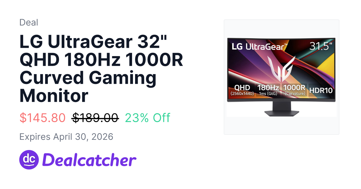 LG UltraGear 32" QHD 180Hz 1000R Curved Gaming Monitor 0 - $145.8