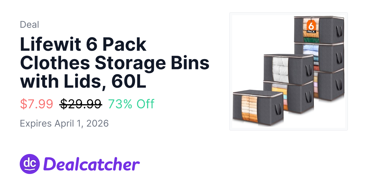 Lifewit 6 Pack Clothes Storage Bins with Lids, 60L - $7.99